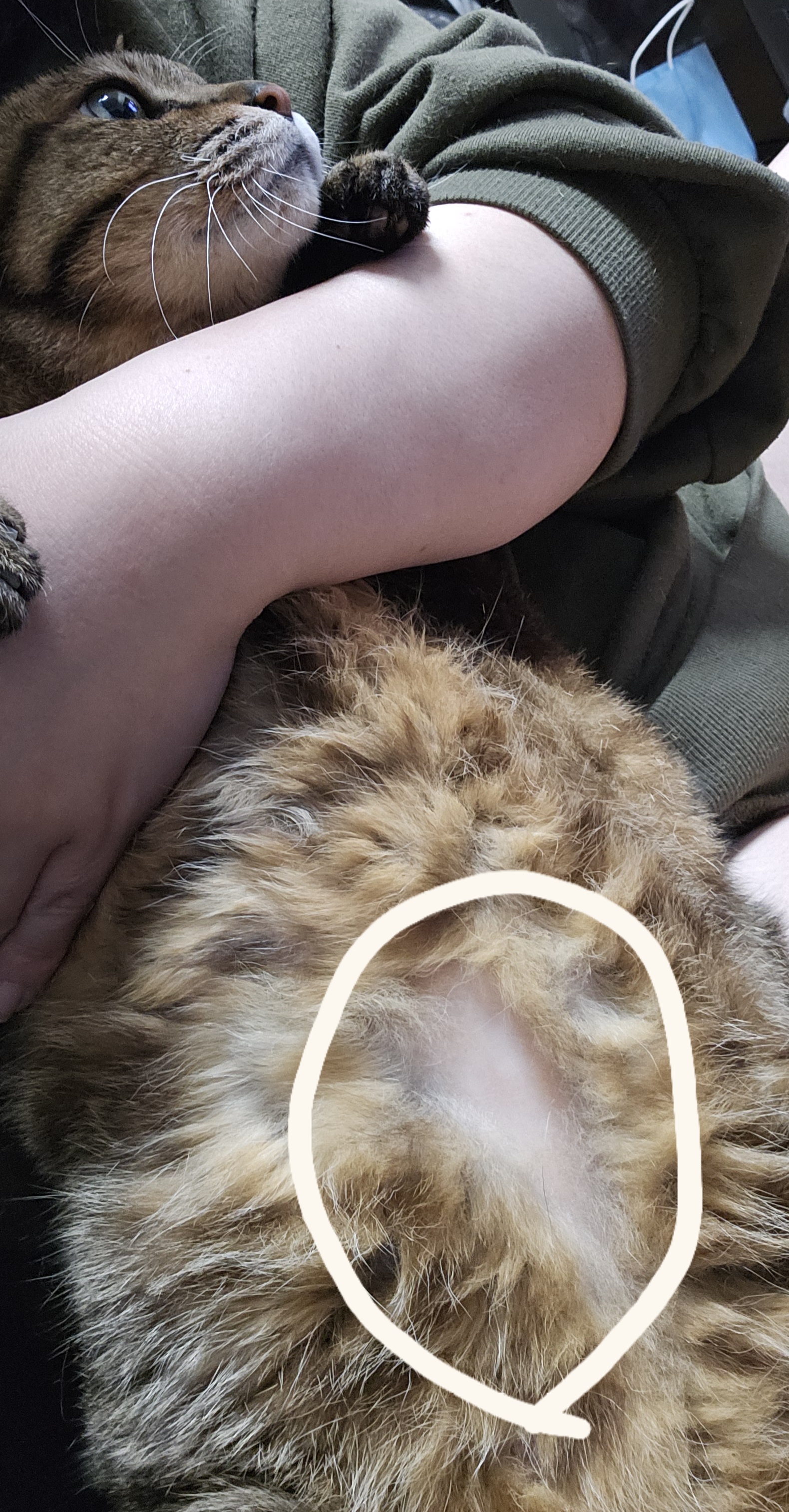 ねこちゃんのお腹の毛が抜ける原因としては、心因性やストレスによる過剰な毛づくろいのほか、真菌症、アレルギー、寄生虫、その他の皮膚炎、膀胱炎などによる腹部の違和感なども考えられます。心因性かどうかも含め、お写真だけで原因を判断することは難しく、必要に応じて触診や検査を行いながら、ほかの病気がないか確認していくことが多いため、一度かかりつけの先生にもご相談いただくことをお勧めいたします。