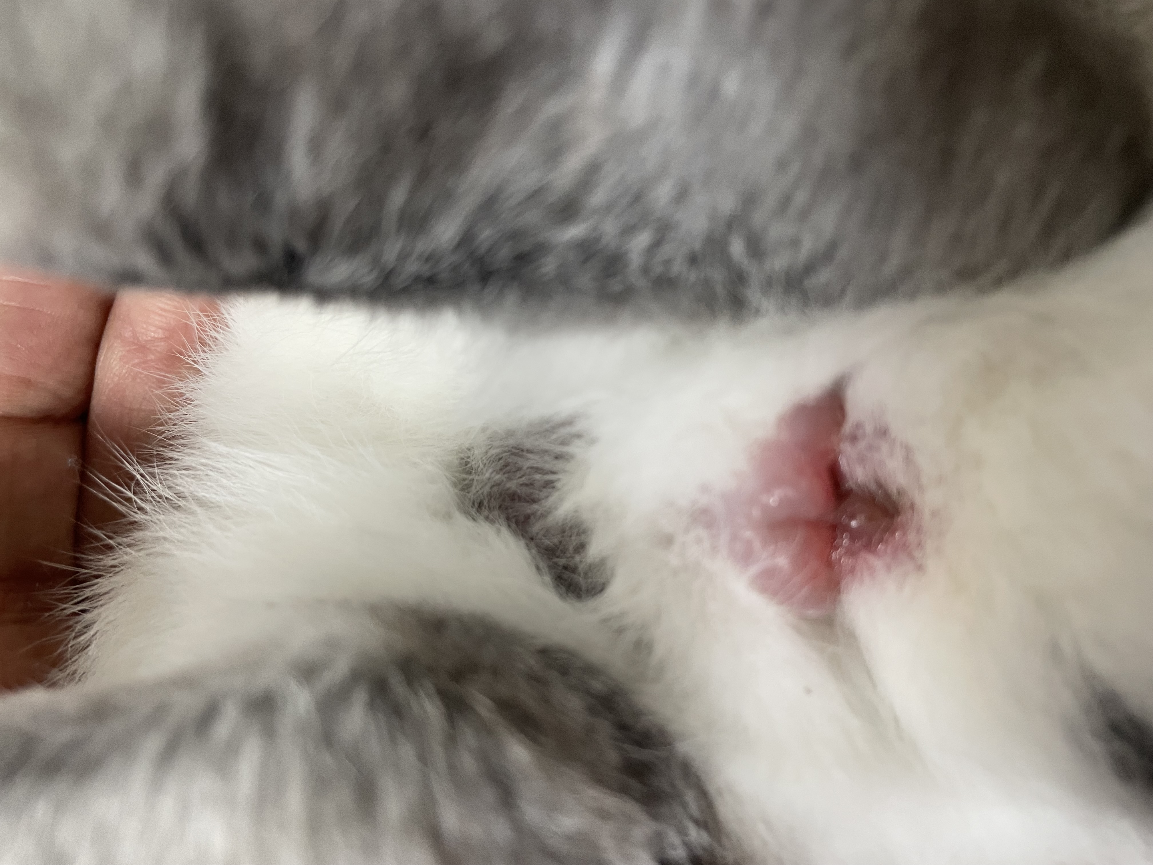 男のうさぎではペニスや包皮が、女のうさぎでは外陰部や肛門周囲が腫れます。また口や眼、鼻の周りなどに小さな水疱(すいほう)ができます。時間の経過とともに 水疱が潰瘍(かいよう)※となり、かさぶたができます。痒みを伴うこともあり、顔をグルーミングすることで前脚にも同様の症状が広がることがあります。鼻の周りに症状があると、クシャミや鼻水が出ることもありますが、主に症状は皮膚にみられます。