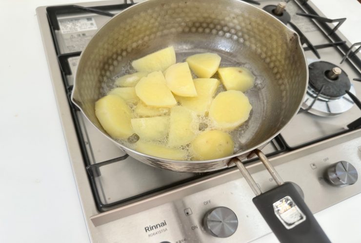 1.皮を剥いたジャガイモを1.5cmの厚さにカットして柔らかく茹でる。