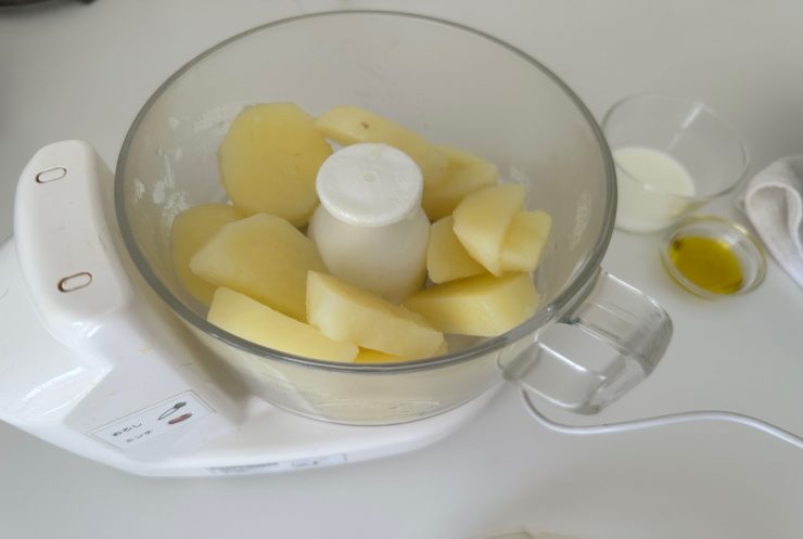 6.フードプロセッサーで潰したジャガイモの上に入れ、牛乳とオリーブオイルを加えてさらに撹拌する。