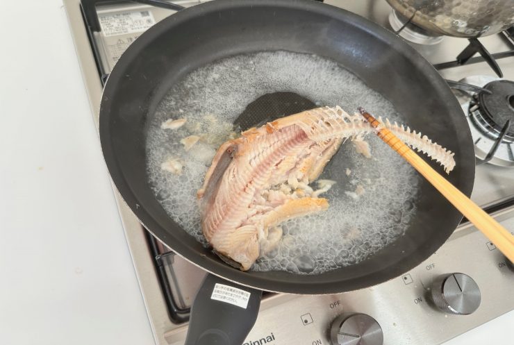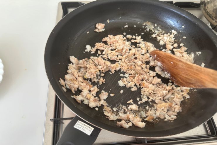 4.再度、ホッケが半分くらい浸かるくらいの水を入れて骨を取りながら水分がほぼなくなるまでほぐしていく。