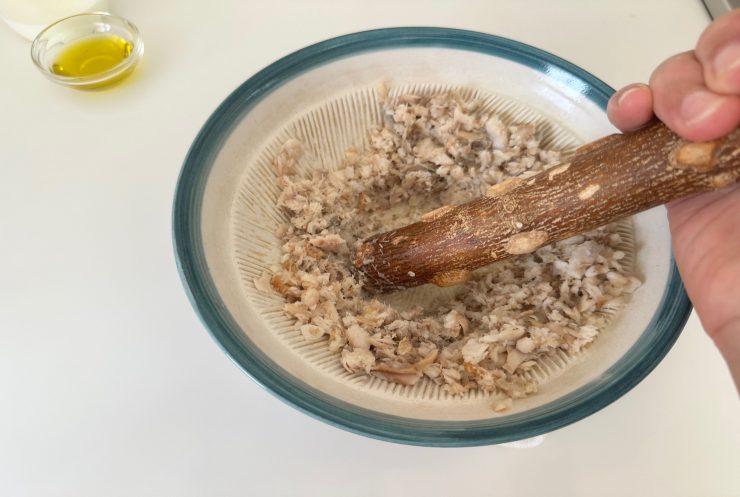 5.すり鉢でホッケを潰しながら、小骨を取り除く。
