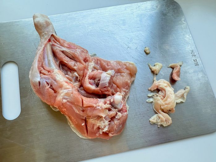 骨つきにしたワケは、骨の周りにはうま味の宝庫である「骨髄」「軟骨」「筋膜」「ゼラチン質」が多いこと、加熱中に肉が縮みにくく、水分を保持しやすいなどのメリットがあるからです。