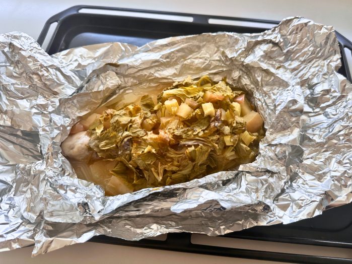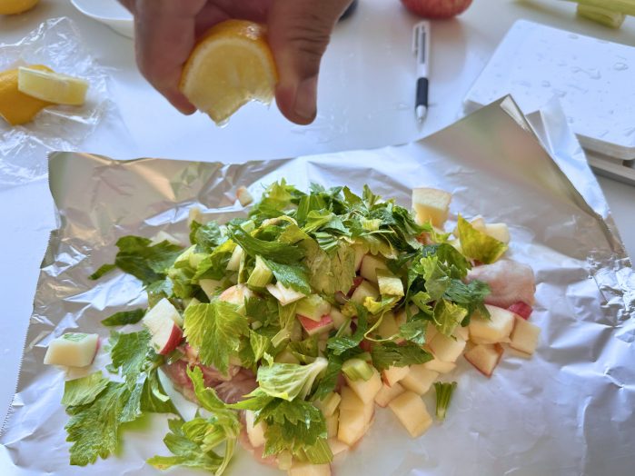 3.アルミホイルを2枚重ねて広げ、オリーブオイルを塗り、チキンレッグの皮目を下にして置いたらりんごとセロリを被せてレモン果汁を搾る。その後、上からもホイルを被せてしっかりと包んで20分くらい置いておく。