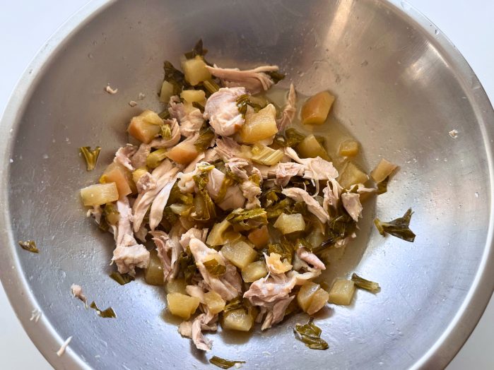 6.アルミホイルを開き、鶏の骨を外し、身をほぐして全体を混ぜる。