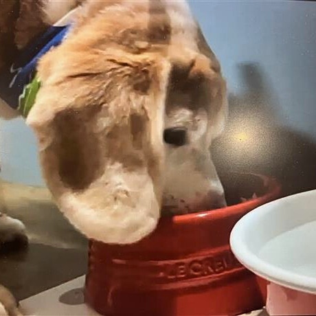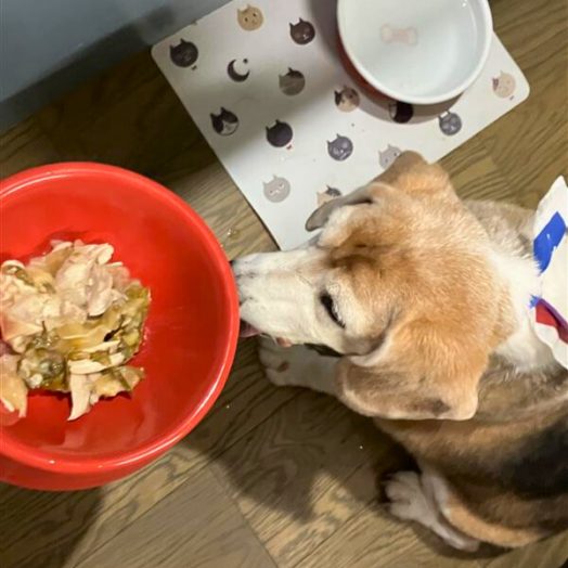 チキンが食べやすいサイズにカットされていたためすぐに完食。食べ終わった後もお皿を舐めていました。