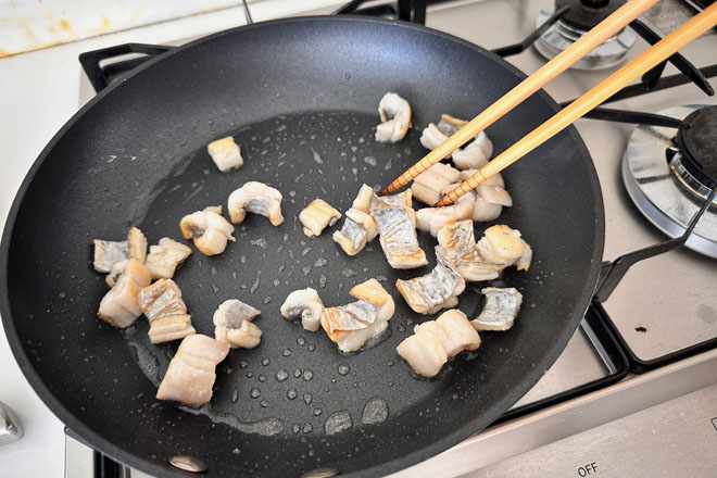 2. フライパンで表面がまんべんなくキツネ色になるまでソテーする。