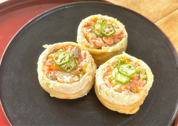 7.油揚げが冷めたら軽く水分を搾り、具材を詰めて輪切りのオクラを飾る。