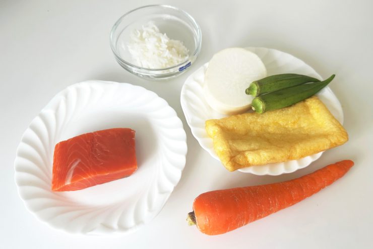 4.オクラは冷水にとり、飾りの分だけ薄い輪切りにし、残りはみじん切りにする。