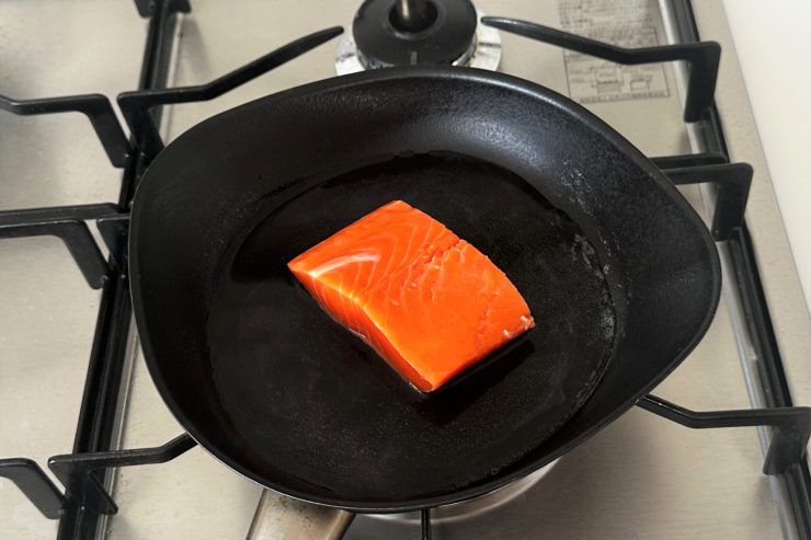 1.鮭の切り身をフライパンに置き、油を使わず少量の水を加えて中火にかける。火が入り始めた表面から身をほぐしていき、バラバラになるまで火を通す。途中、焦げつきそうになったら水を少量ずつ加える。