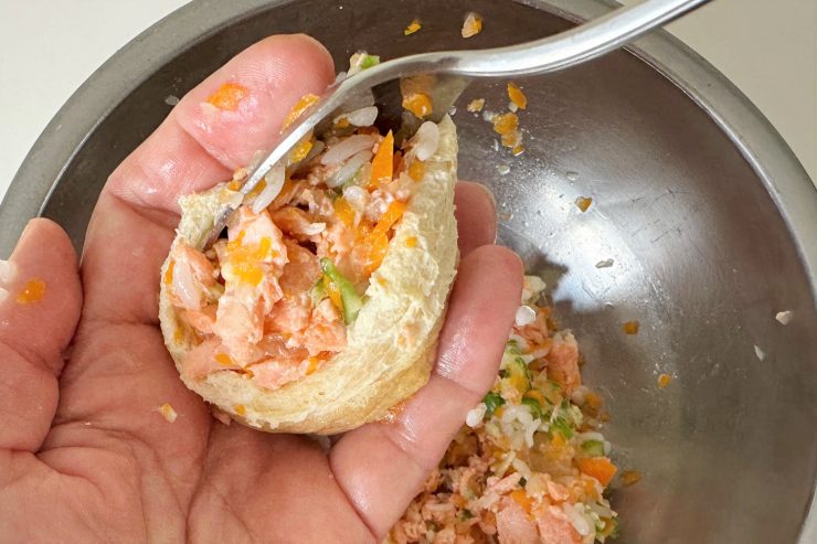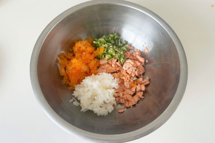 6.ボウルに鮭、ご飯、みじん切りにした野菜を入れ、混ぜる。