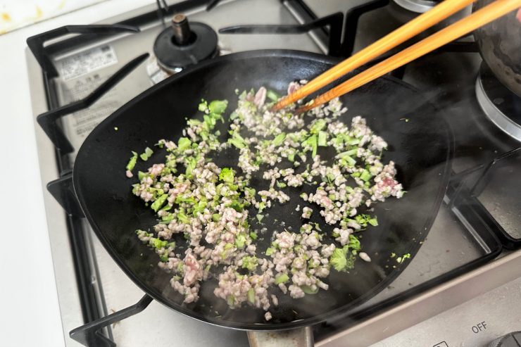 1.ブロッコリーをみじん切りにし、合い挽き肉と一緒にオリーブオイルでソテーする。
