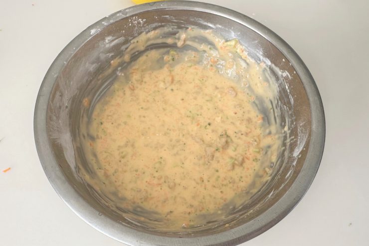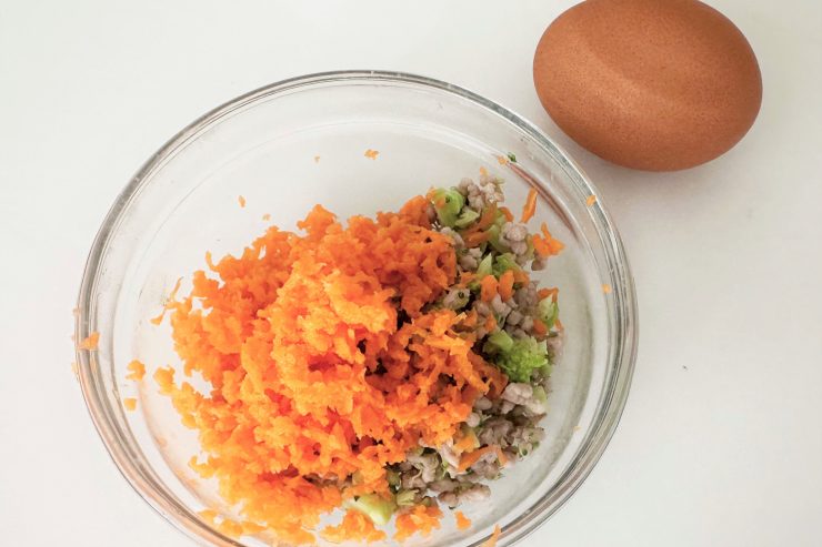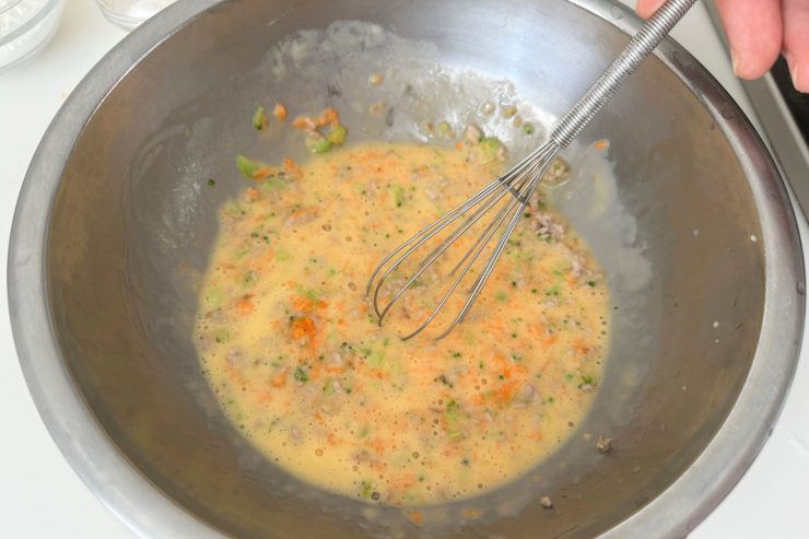 3.ボウルに卵とヨーグルト50gをよく混ぜ、ひき肉、ブロッコリー、にんじんも加えて混ぜる。
