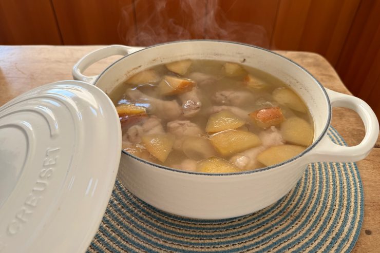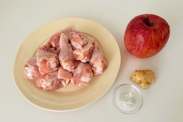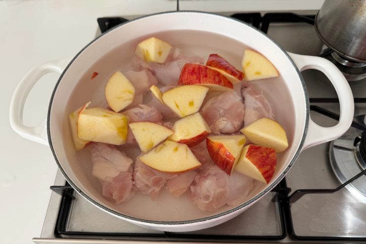 1. 鍋に1400mlの水を入れ、水洗いした鶏手羽元と乱切りにしたりんご、生姜の皮一かけ、天然塩を入れて中火にかける。沸騰寸前まで中火のまま、沸騰直前に弱火にして約1時間ゆっくりと煮る。