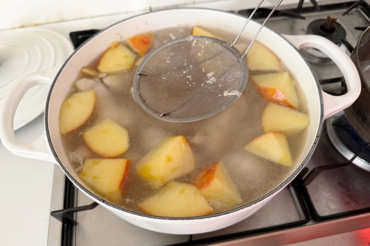 2. 強火にしないことでアクが出にくくなりますが、時々覗いてアクが出るようなら取り除く。