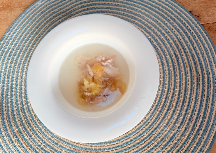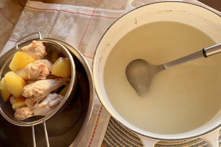 蓋をしないで弱火でコトコト、が、透き通ったブロスを作るコツです。