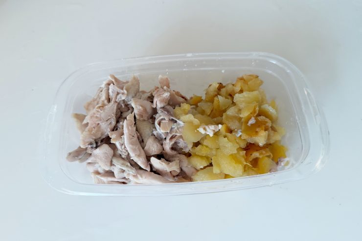 4. 人肌くらいの温度に冷めたら具材とスープに分け、鶏肉を骨から外して食べやすく割き、りんごはフォークなどで潰す。