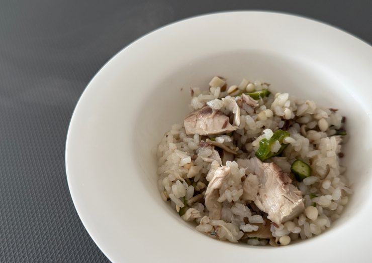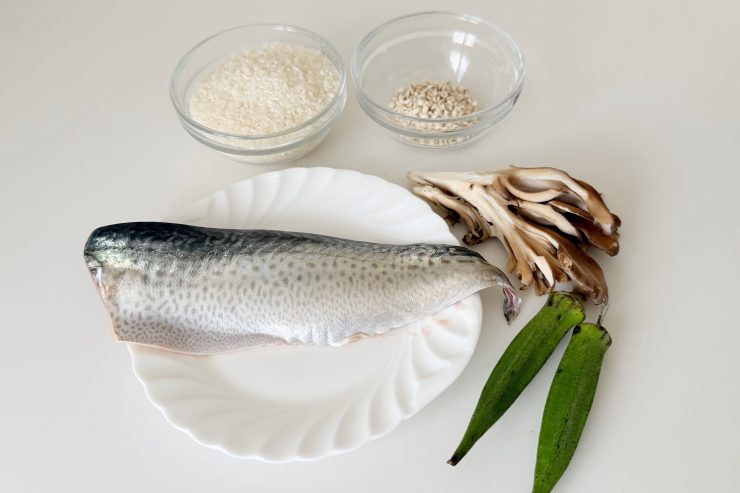 このメニューは、粘膜を保護し、炎症を和らげてくれる食材をふんだんに使っています。鯖のオメガ3脂肪酸、舞茸のβグルカン、オクラの水溶性食物繊維、ハトムギの保湿や抗炎症という性質を利用して、美味しいごはんにしました。