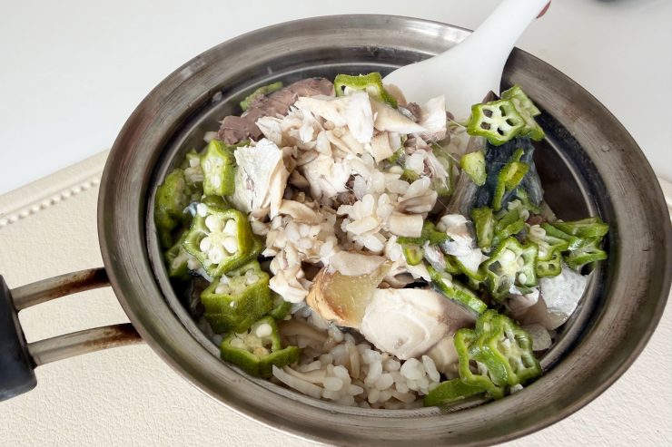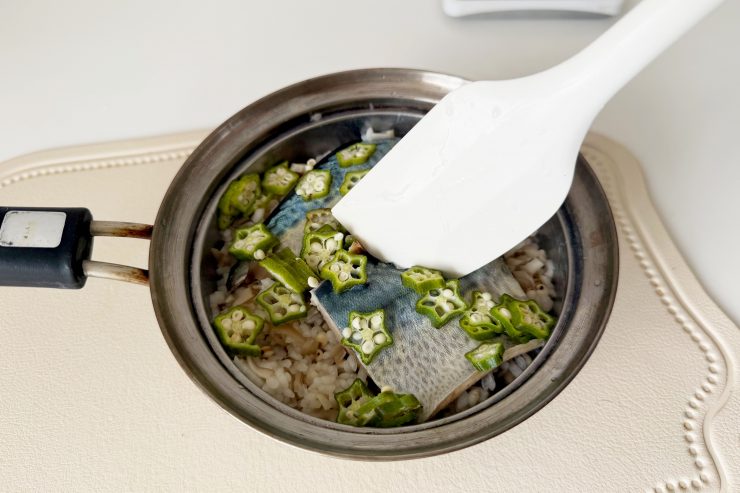 4.沸騰後、弱火で5分、火を止めたら輪切りのオクラを全体に散らし、蓋をぴっちり閉めて15分蒸らす。