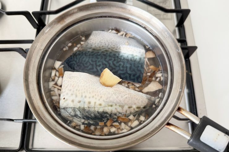 2.微塵切りにした舞茸を入れ、その上に半分に切った鯖の切り身、生姜を入れ、蓋をして火にかける。(強めの中火)