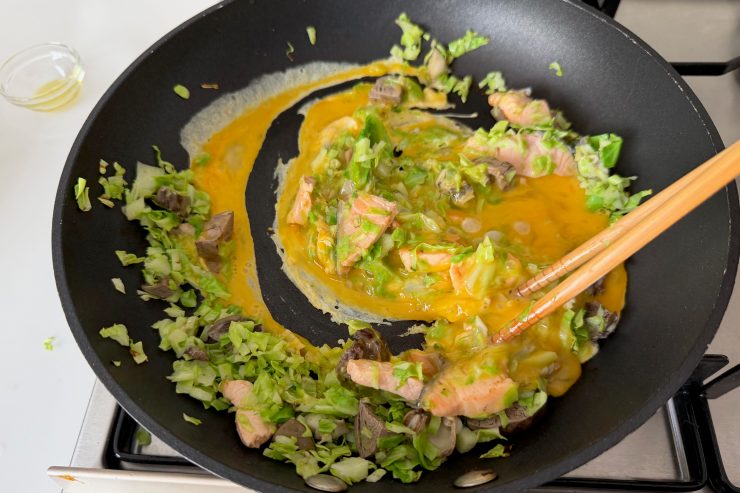 4.鮭がほぐれたら、溶き卵を加え、大きくかき混ぜて完全に火が入る前に火を止め、余熱で固める。