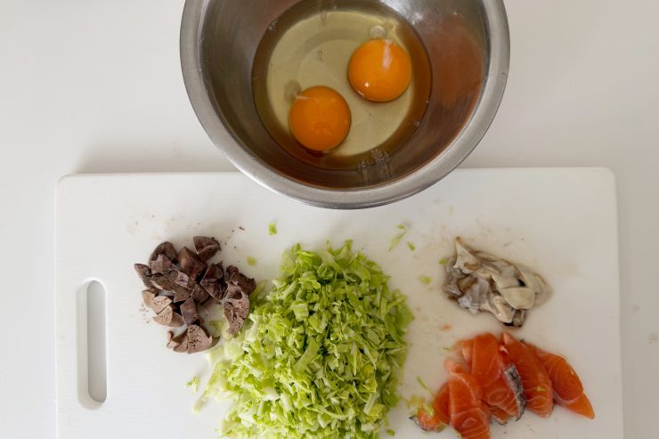 2.春キャベツは粗微塵、鮭は5mm程度のスライス、牡蠣と鶏レバーは1cm角ぐらいにカットし、卵は割ほぐしておく。