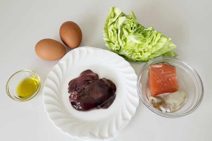このメニューは、卵のビオチンやアミノ酸スコアの高いタンパク質、牡蠣や鶏レバーに含まれる亜鉛、サーモンに含まれる抗酸化物質(アスタキサンチン)やオメガ3脂肪酸など、換毛をサポートする食材をたっぷり使っています。