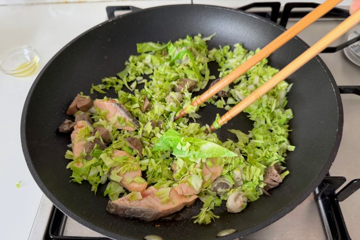 3.フライパンにオリーブオイルをひき、温まったらサーモン、牡蠣、鶏レバーを炒め、途中でキャベツも加えて炒める。
