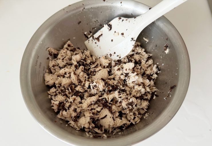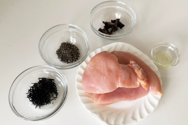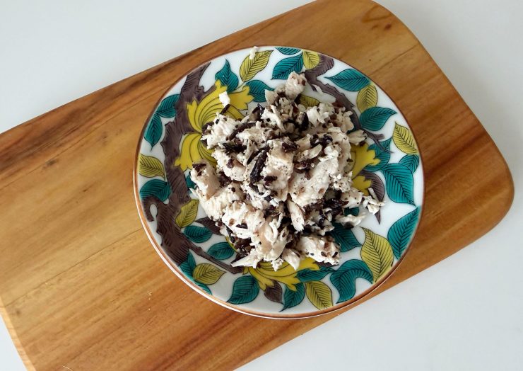 鶏胸肉に含まれる良質のタンパク質を、植物性食物に含まれるミネラルを含んだ『生ふりかけ』で和えれば、消化しやすくて美味しい栄養補給になります。