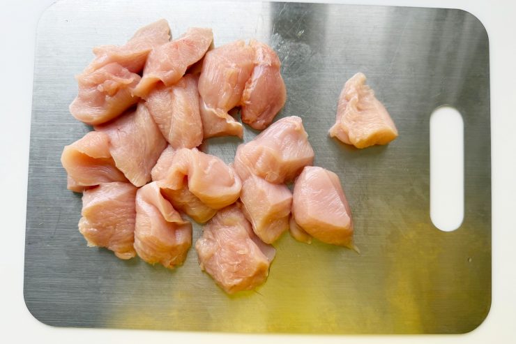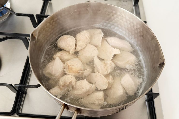 2.鶏胸肉を適度な大きさ(後でフードプロセッサーにかけられる大きさで小さすぎないのが理想的)にカットし、ひたひたの水を加えて火にかける。