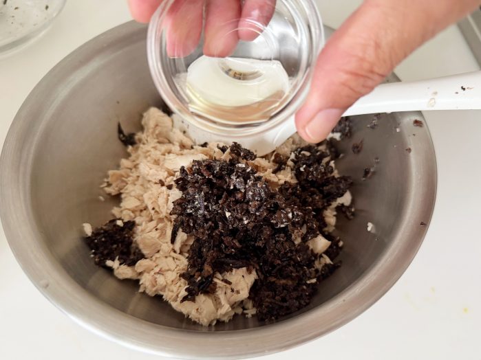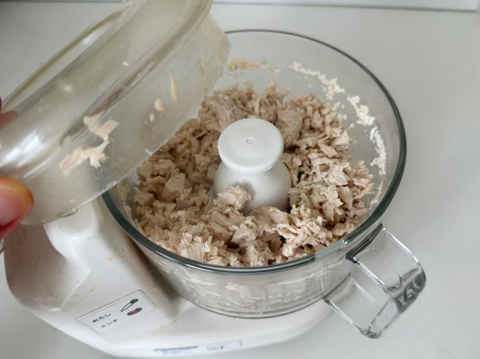 4.鶏肉を取り出してフードプロセッサーにかけ、粗めにカットする。