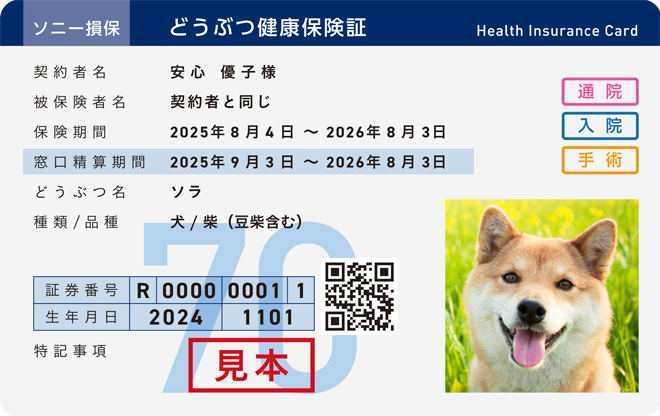 ペットのお写真を掲載したオリジナルの「どうぶつ健康保険証」を発行します。ソニー損保のペット保険「どうぶつ健保」対応病院(アニコム損保の対応動物病院とは異なります。)で「どうぶつ健康保険証」をご提示いただくと、病院の窓口で保険を使って診療費を精算できるため、保険金の請求手続きは不要です。また、窓口精算以外にも、専用のウェブサイトにて保険金のご請求が可能です。