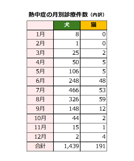 2025年の熱中症による診療件数は、犬1,439件、猫191件でした。