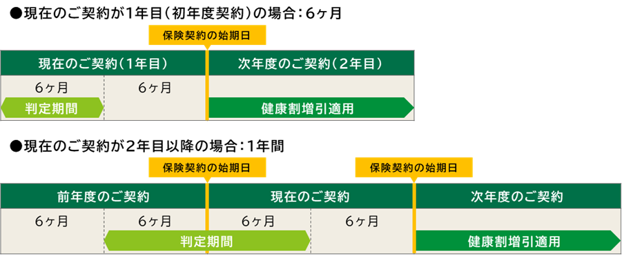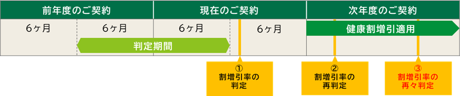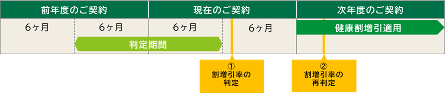 判定期間中の保険利用回数をもとに次年度保険料に適用する割増引率の判定を行い(下図①)、割増引率を反映した次年度保険料をご契約者にご案内します。